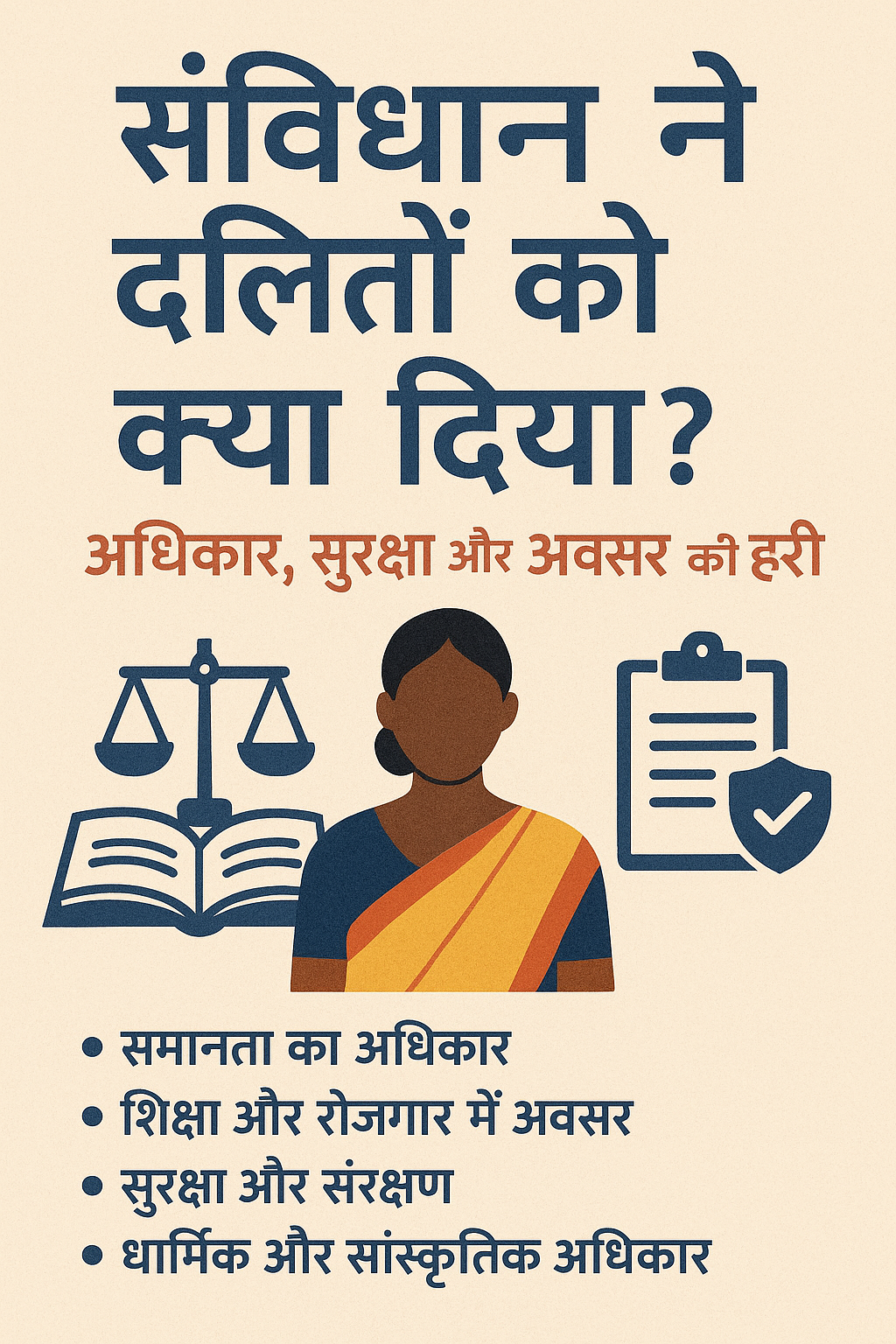 भारतीय संविधान केवल एक क़ानून की किताब नहीं, बल्कि समाज में समानता, न्याय और स्वतंत्रता का प्रतीक है। हमारे संविधान के निर्माता, डॉ. बाबासाहेब आंबेडकर, ने विशेष रूप से यह सुनिश्चित किया कि दलित और अन्य पिछड़े वर्गों को समाज में बराबरी का दर्जा मिले। आज हम जानेंगे कि संविधान ने दलितों को क्या-क्या अधिकार और सुरक्षा दी है।